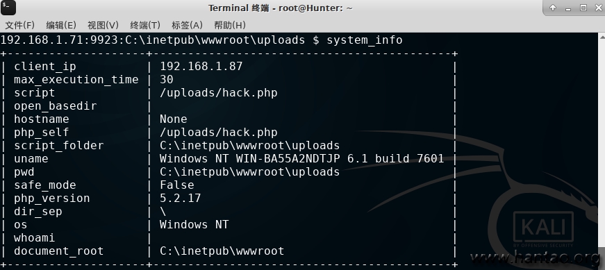 在当前目录中生成连接密码为1,名为hack.php的后门文件,也可以加路径在其他地方生成