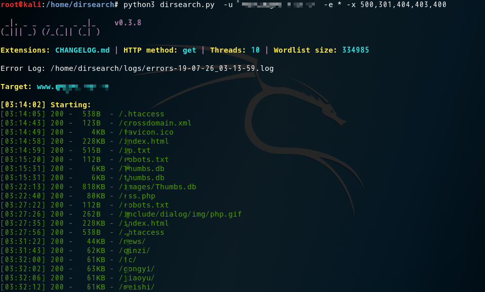 python3 dirsearch.py -u -r "网站域名" -t 20 -x 301,403,404,500,501