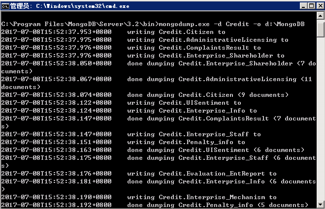 eg:mongodump.exe -d hunter -o d:\sqldata\ #不需要认证,省略了用户名和密码参数
