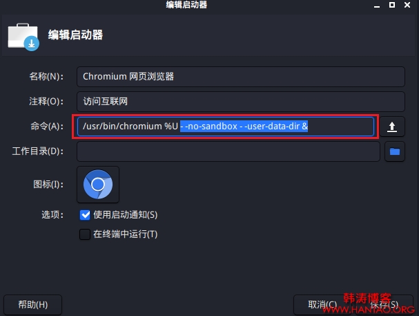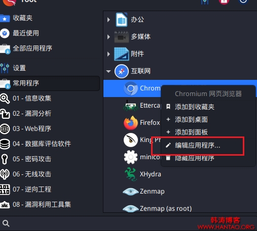 点击启动按钮--选择常用程序--展开互联网目录--选中Chromium右击--选择编辑应用程序