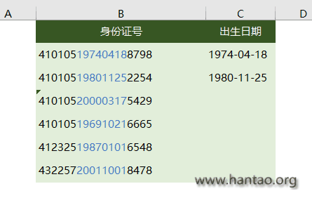4.提取身份证日期:写好第一行数据,填充前要把单元格格式设置成文本格式,然后在前2个单元格中输入日期,选C4单元格按Ctrl+E填充。